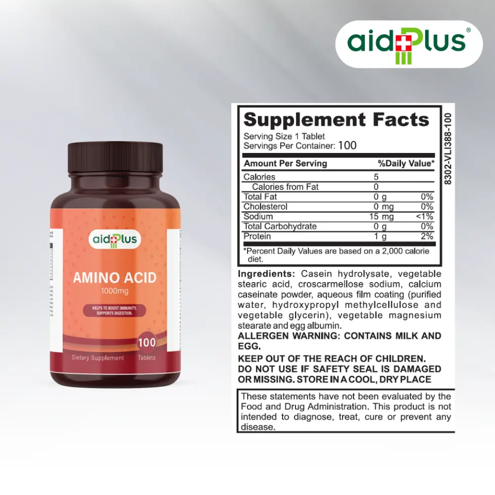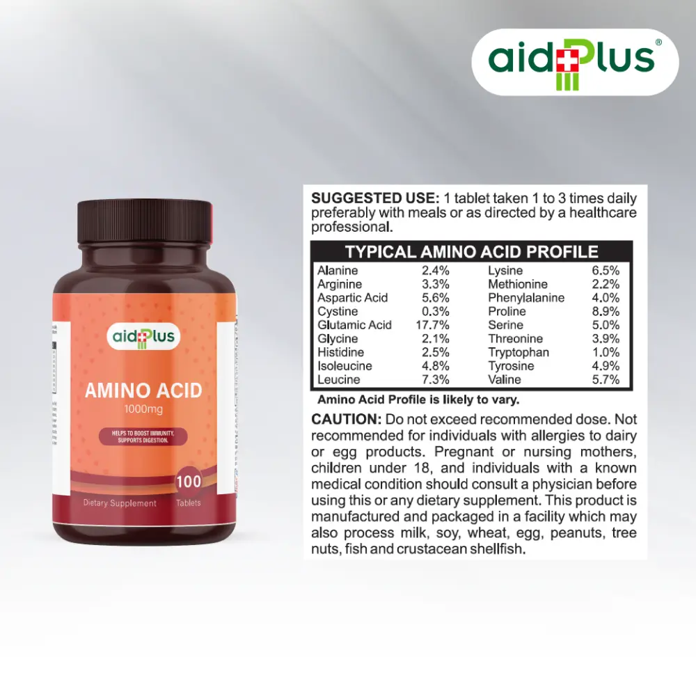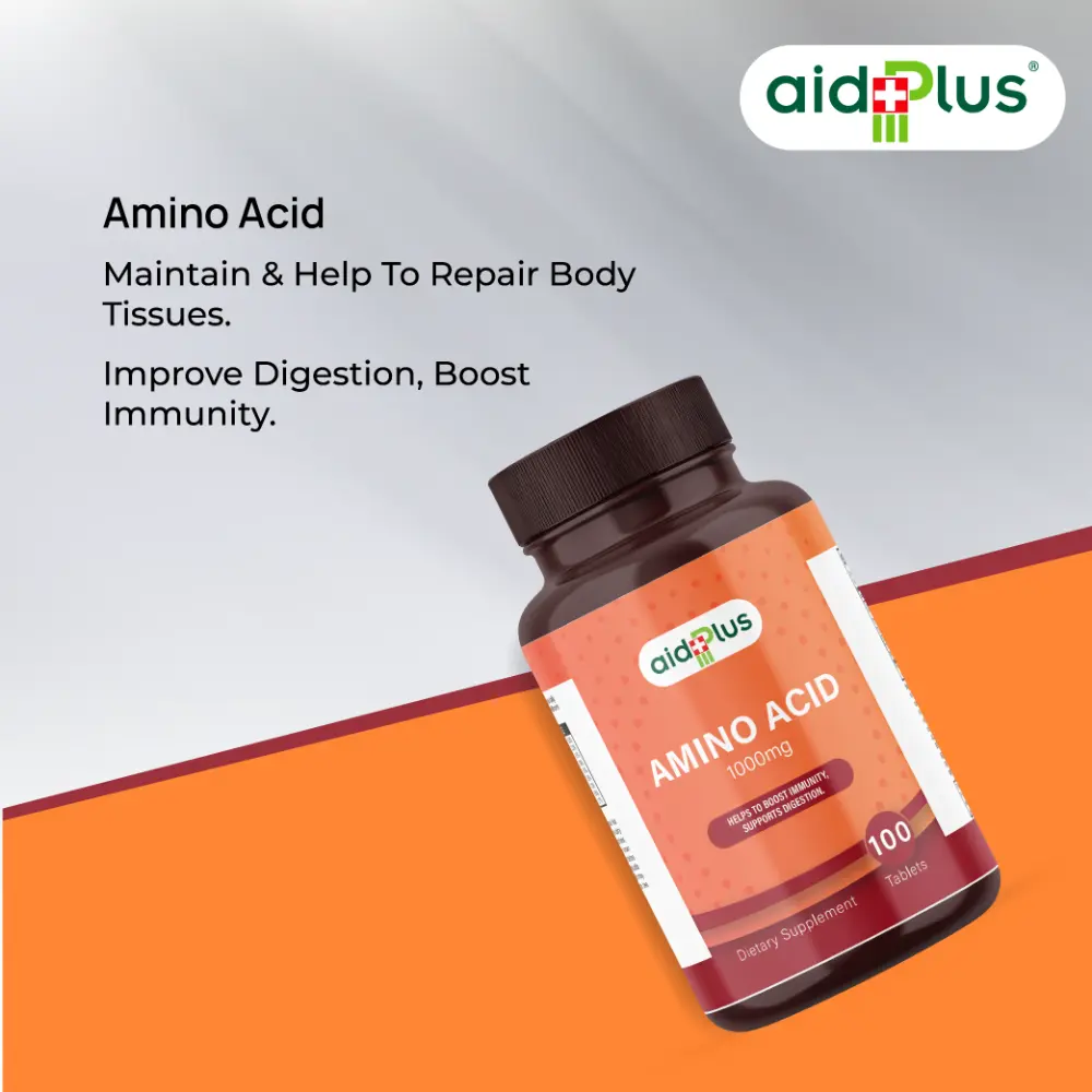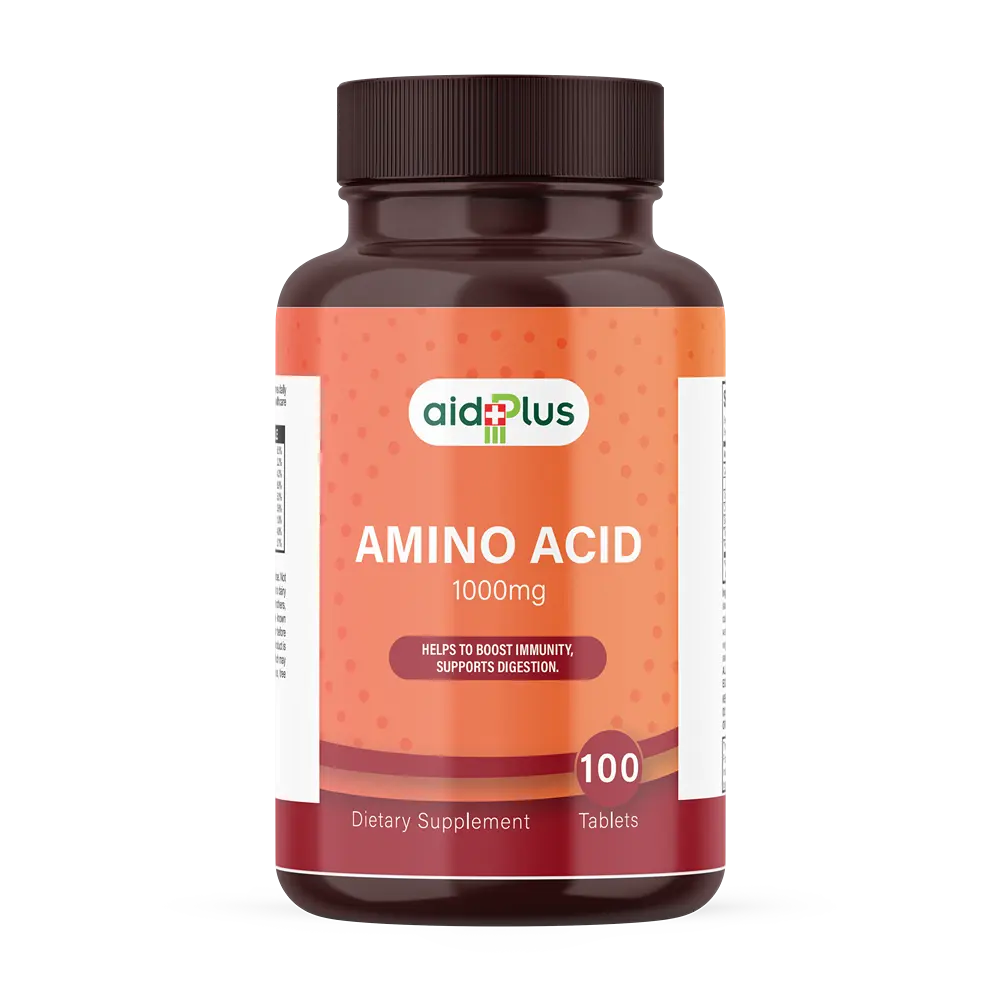 Enhance your wellness and fitness with AID PLUS Amino Acid 1000mg – 100 Tablets. Formulated to support immunity, aid digestion, and promote muscle recovery, this supplement is ideal for active adults and fitness enthusiasts. Amino acids play a key role in protein synthesis, helping your muscles recover faster, while also supporting a healthy immune system and digestive function. Take daily as part of a balanced diet to improve energy, recovery, and overall vitality.