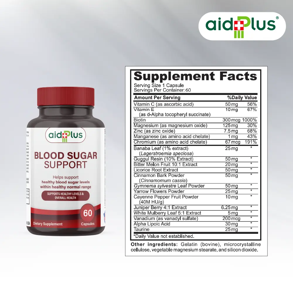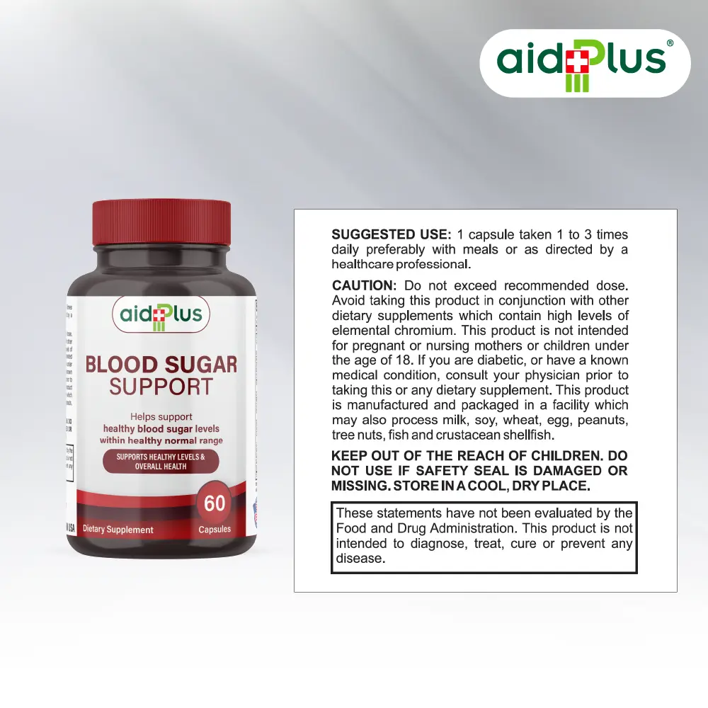 Maintain healthy blood sugar levels with AID PLUS Blood Sugar Support – 60 Tablets. This supplement is formulated with natural nutrients and plant extracts that help regulate glucose, support pancreatic function, and improve metabolic balance. Ideal for adults seeking to manage their blood sugar levels naturally while maintaining overall health. Take daily as part of a balanced diet and active lifestyle to support long-term glucose control.
