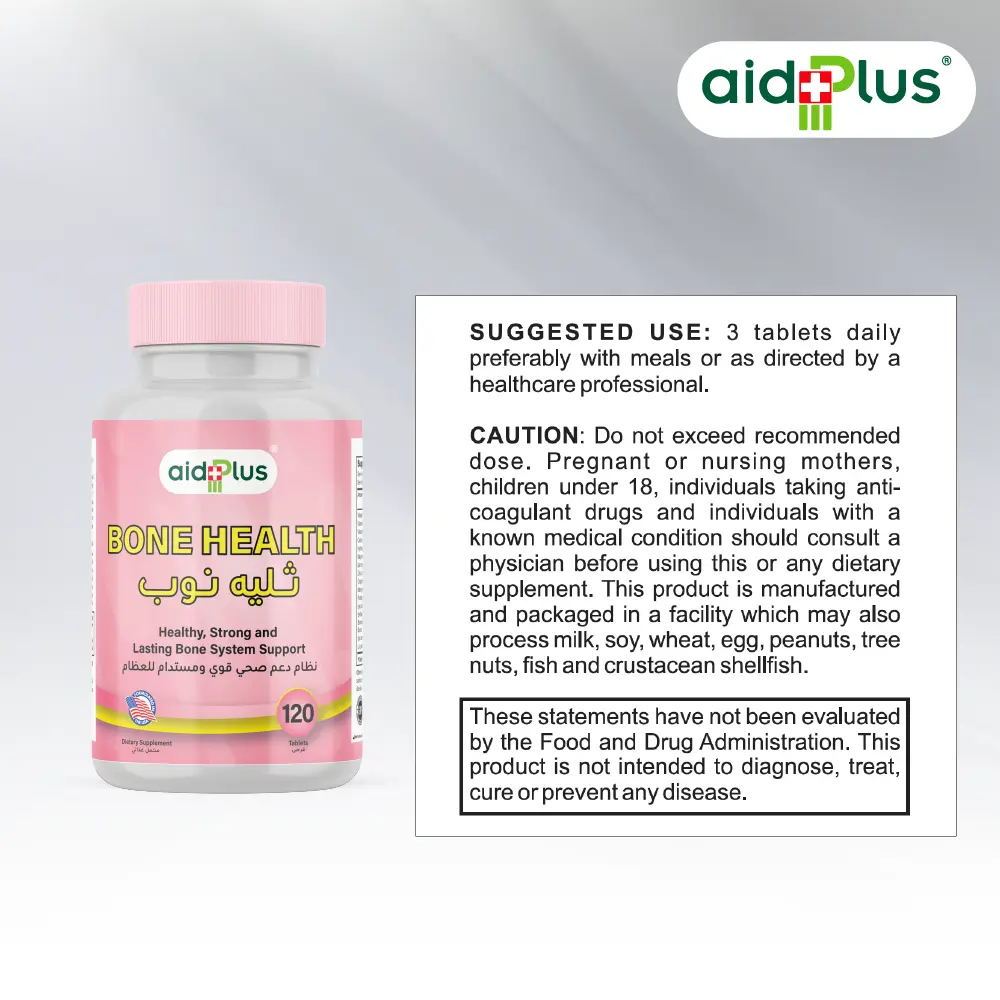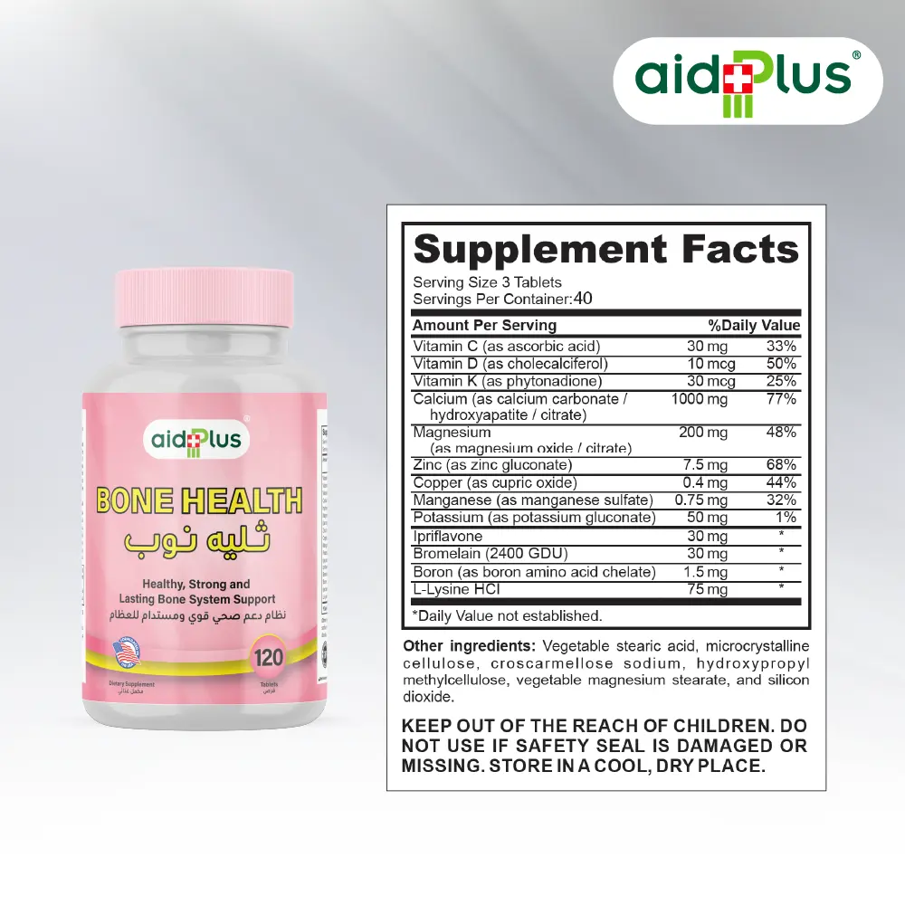 Maintain strong bones and flexible joints with AID PLUS Bone Health – 120 Tablets. Formulated with essential minerals and vitamins, this advanced supplement supports bone density, joint flexibility, and skeletal health. Enriched with calcium, vitamin D, magnesium, and other nutrients, it helps prevent deficiencies, promotes healthy bone metabolism, and supports everyday mobility. Ideal for adults seeking comprehensive bone and joint support for long-term wellness.