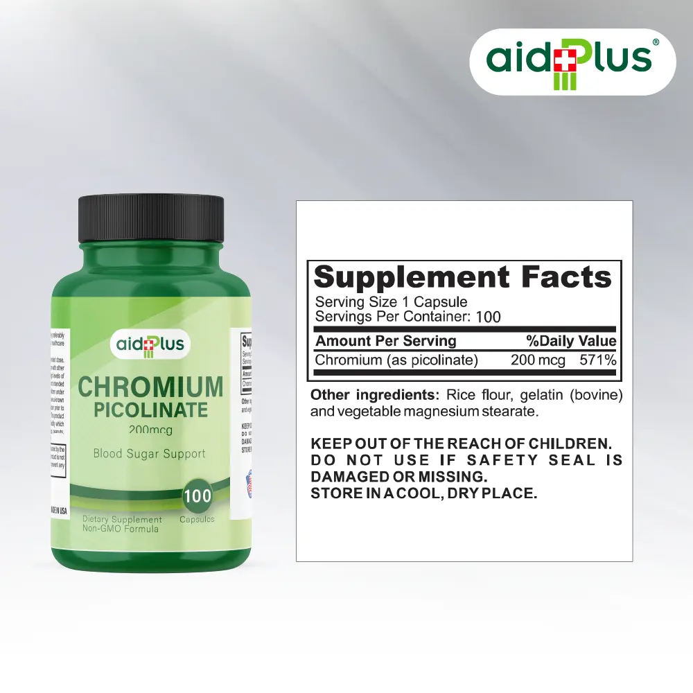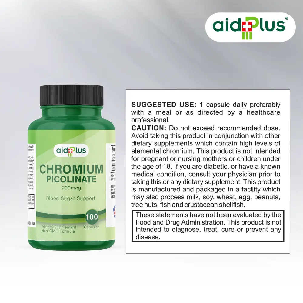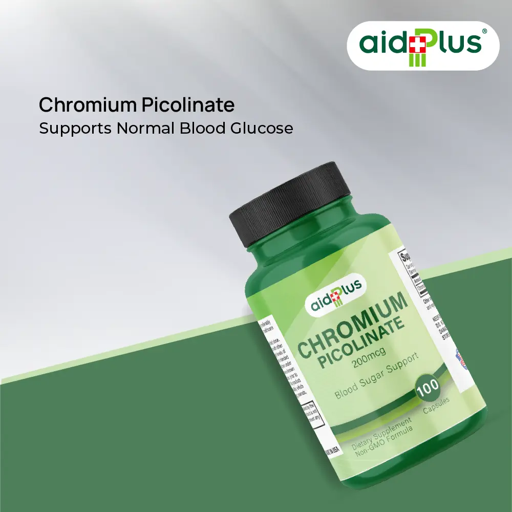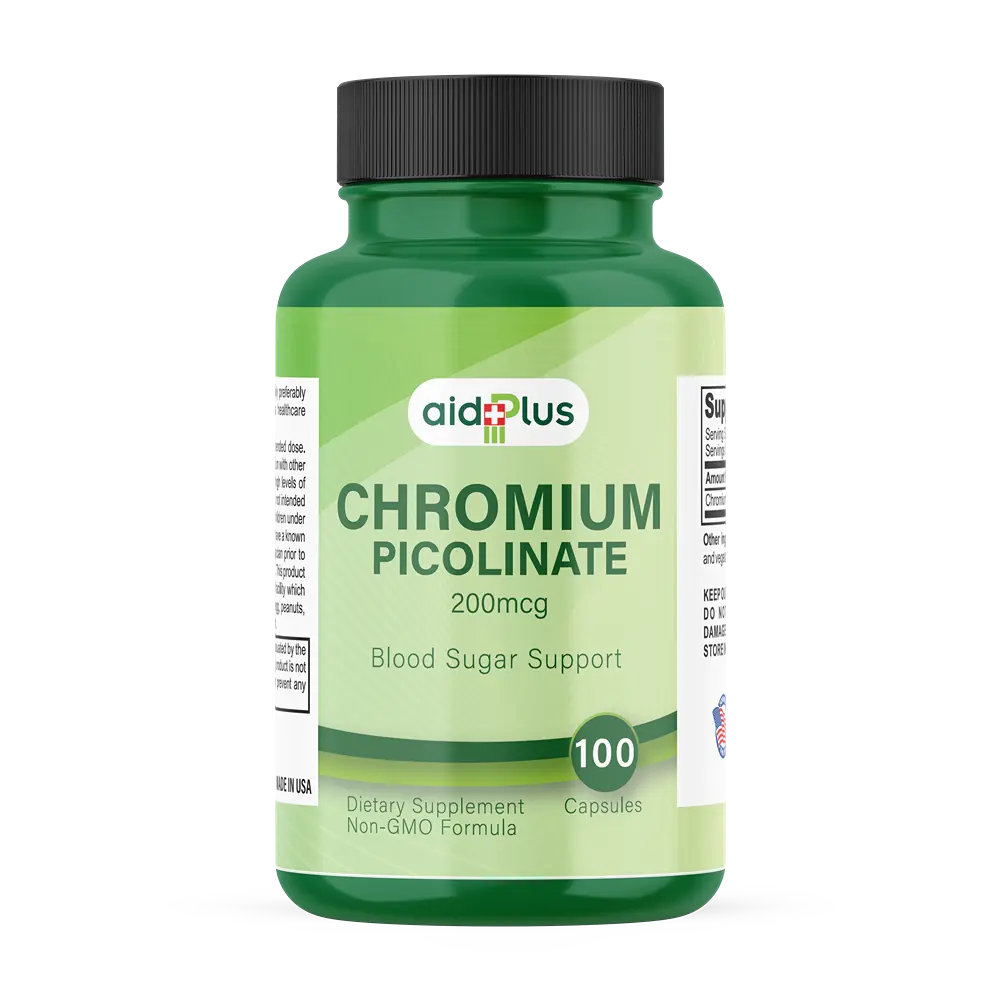 Maintain healthy blood sugar levels and boost metabolic health with AID PLUS Chromium Picolinate 200mcg – 100 Capsules. Each capsule delivers a precise 200mcg dose of Chromium Picolinate, a vital trace mineral that helps regulate glucose metabolism, support insulin sensitivity, and aid energy production. Ideal for individuals looking to manage blood sugar, enhance metabolism, and support overall wellness naturally. Convenient daily capsules make it simple to incorporate into your routine.