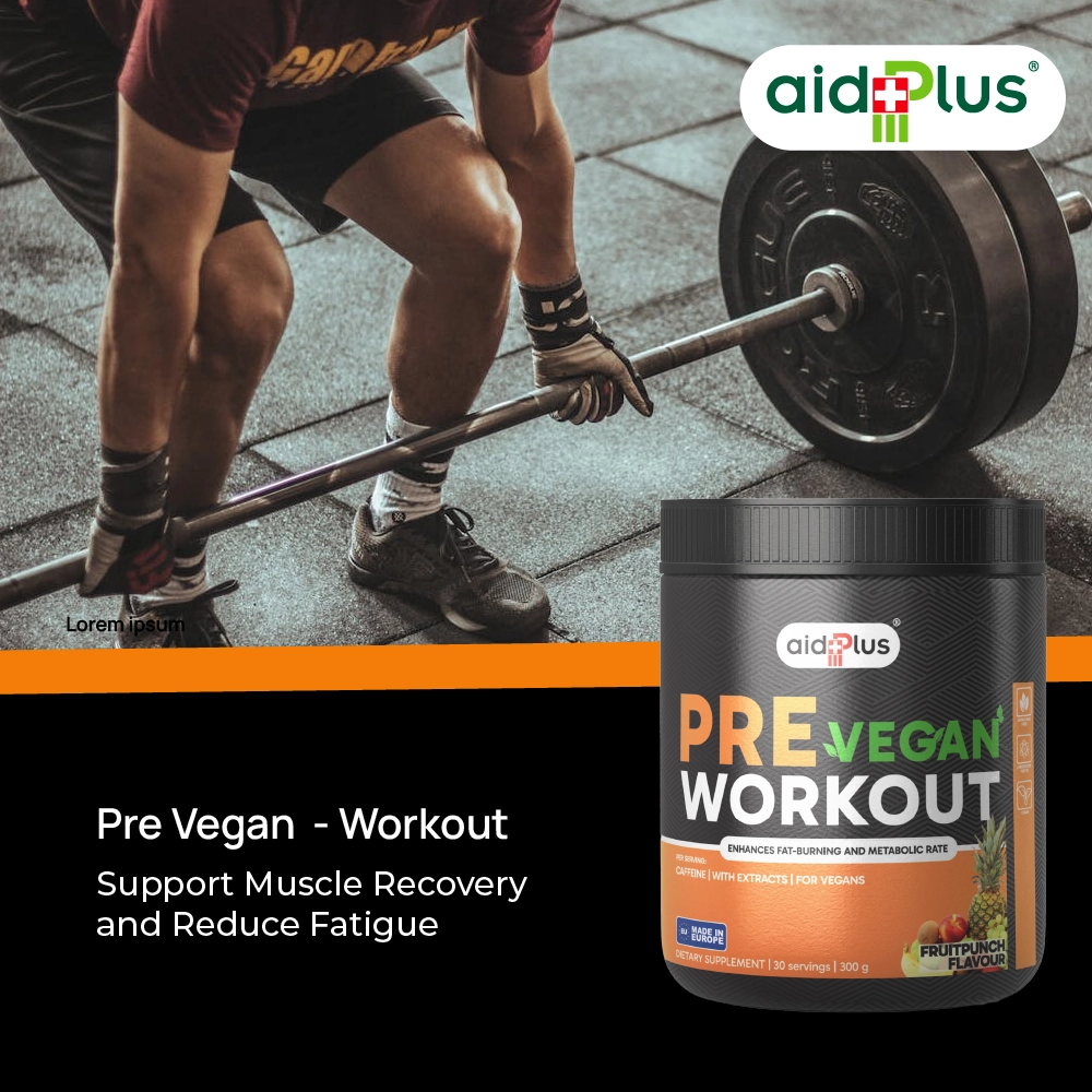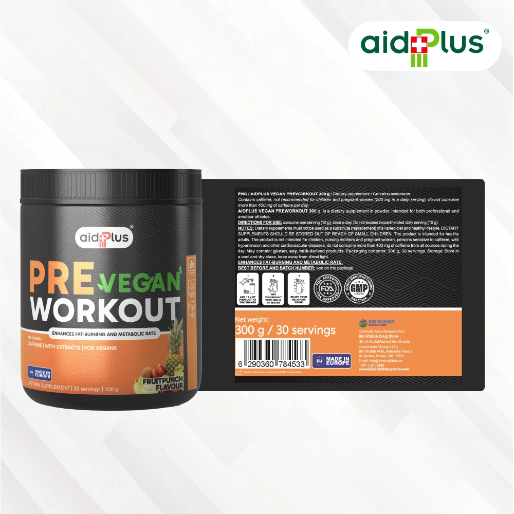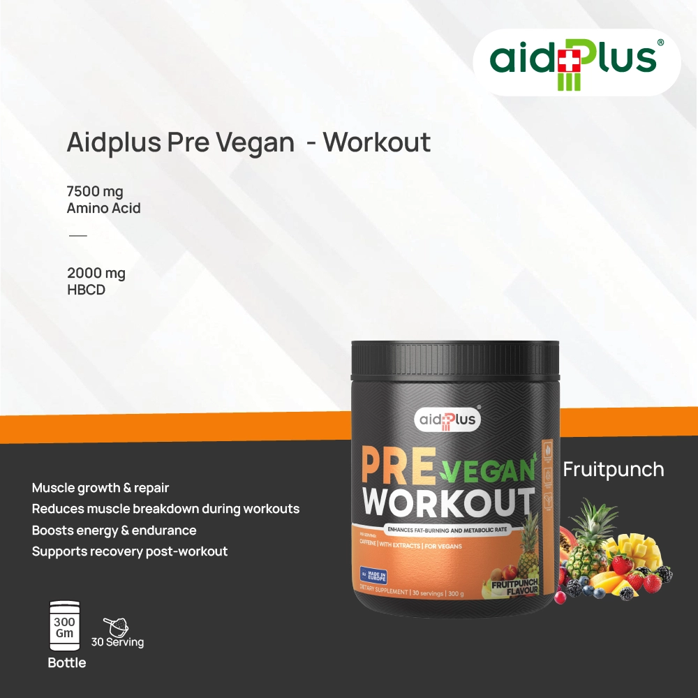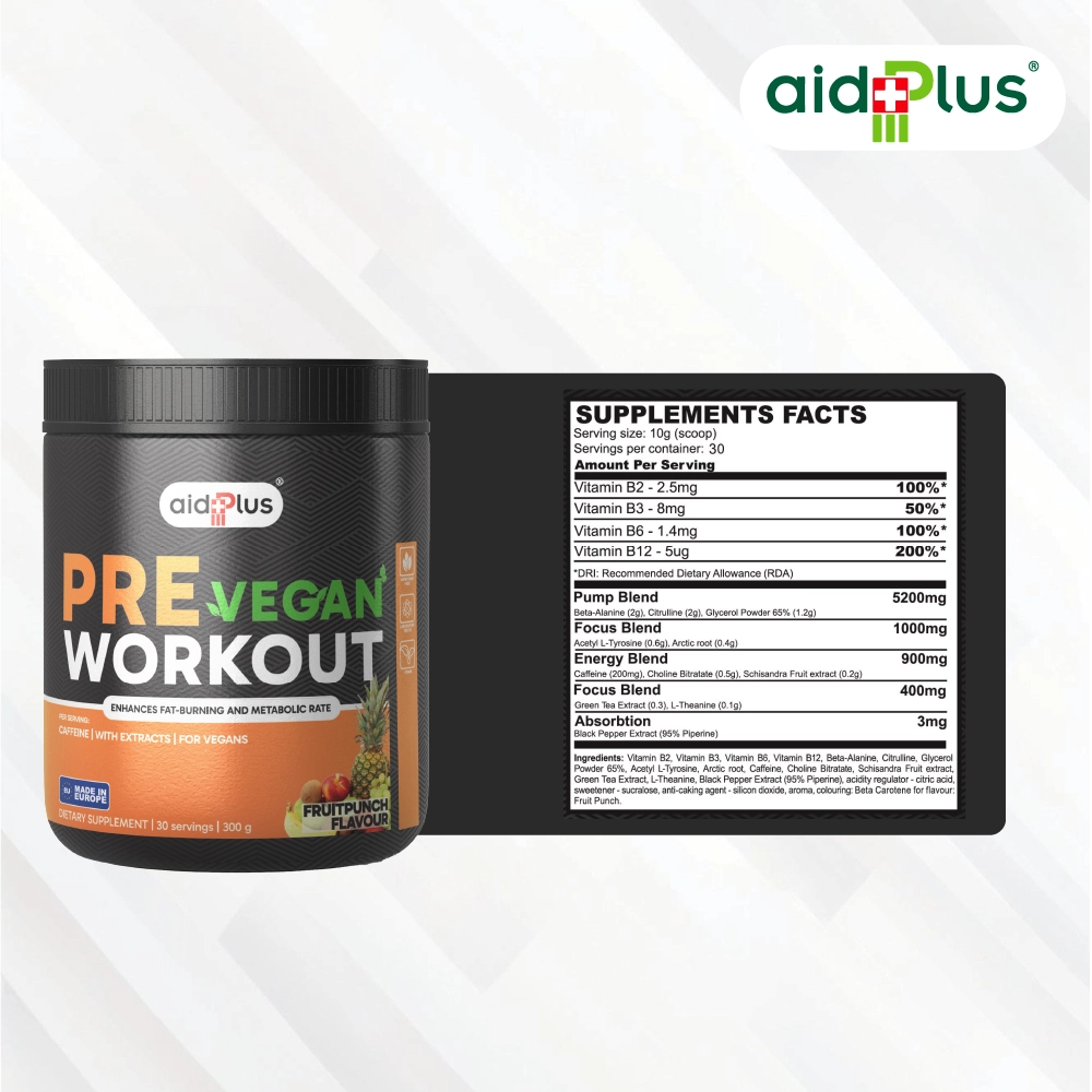 AidPlus Vegan Pre-Workout Fruit Punch 300g is formulated to support energy, focus, and workout performance. Each serving contains a balanced blend of ingredients including caffeine, beta-alanine, and amino acids to help you stay active and maintain endurance during training.