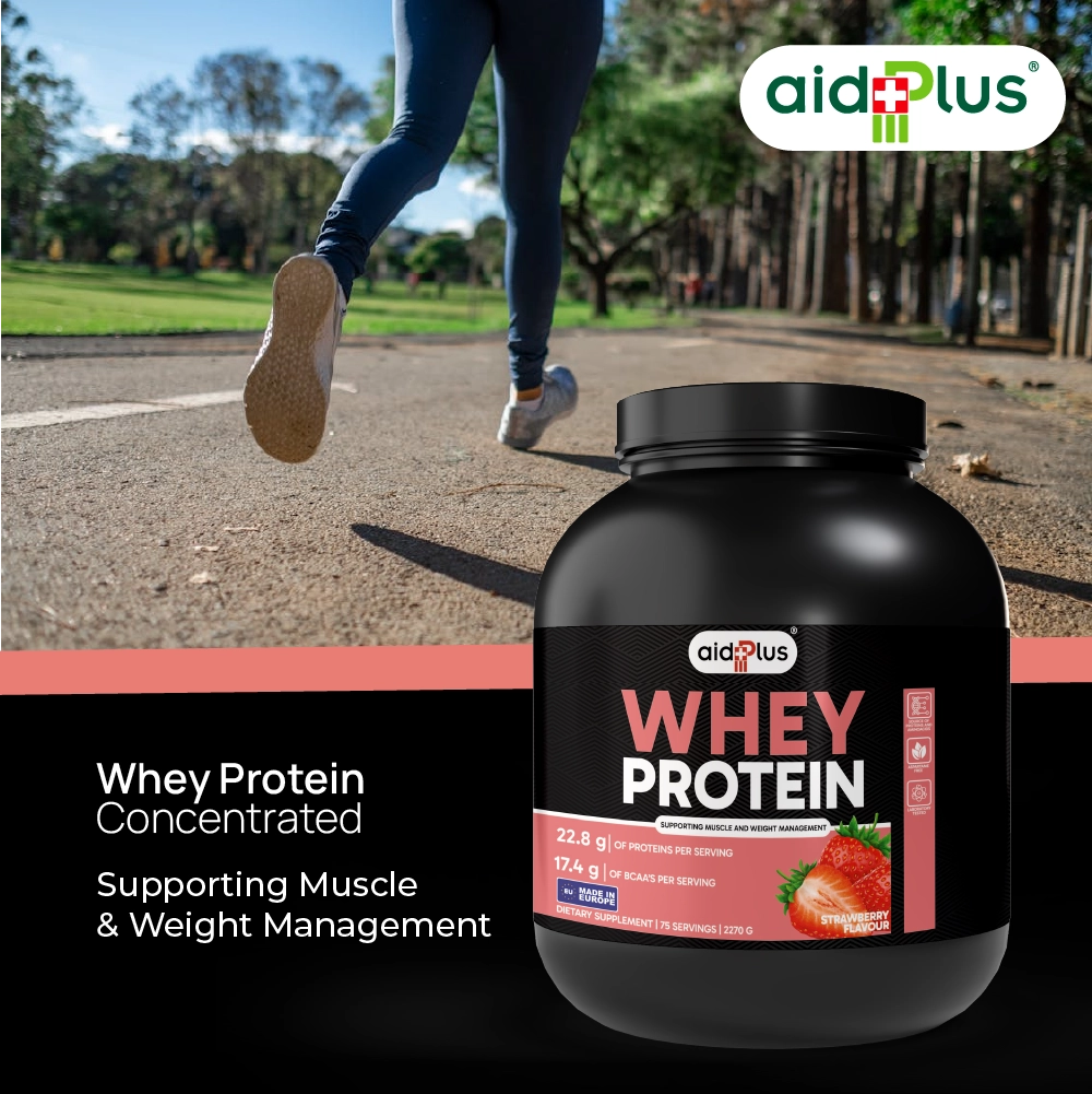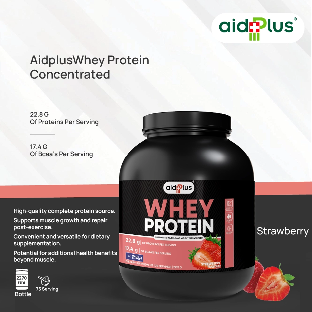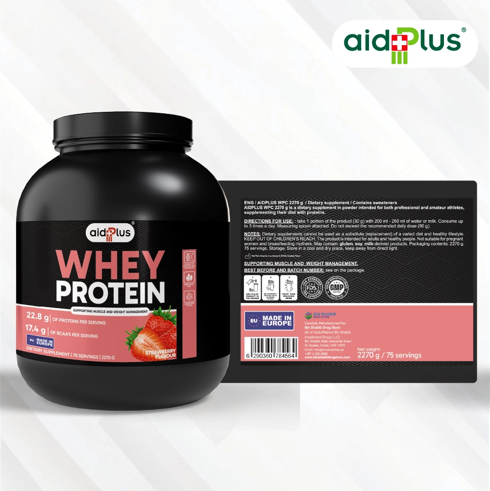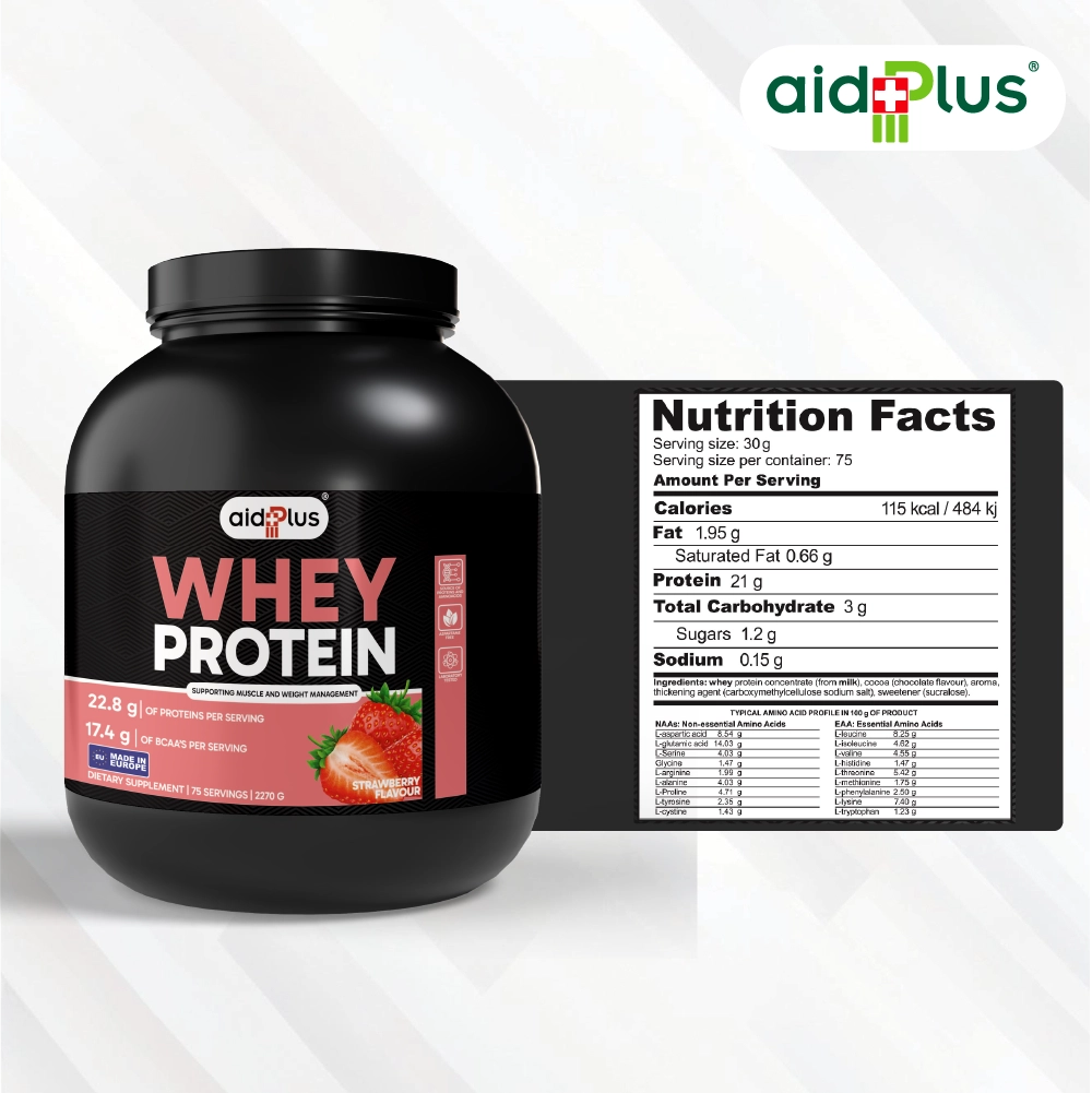 Fuel your workouts and recovery with AID PLUS WPC Strawberry 2270g. Each 30g serving delivers 22.8g of high-quality whey protein, low fat, and minimal sugar, designed to support muscle growth, repair, and weight management. Easy to mix with water or milk, it’s ideal for post-workout recovery or daily protein supplementation.