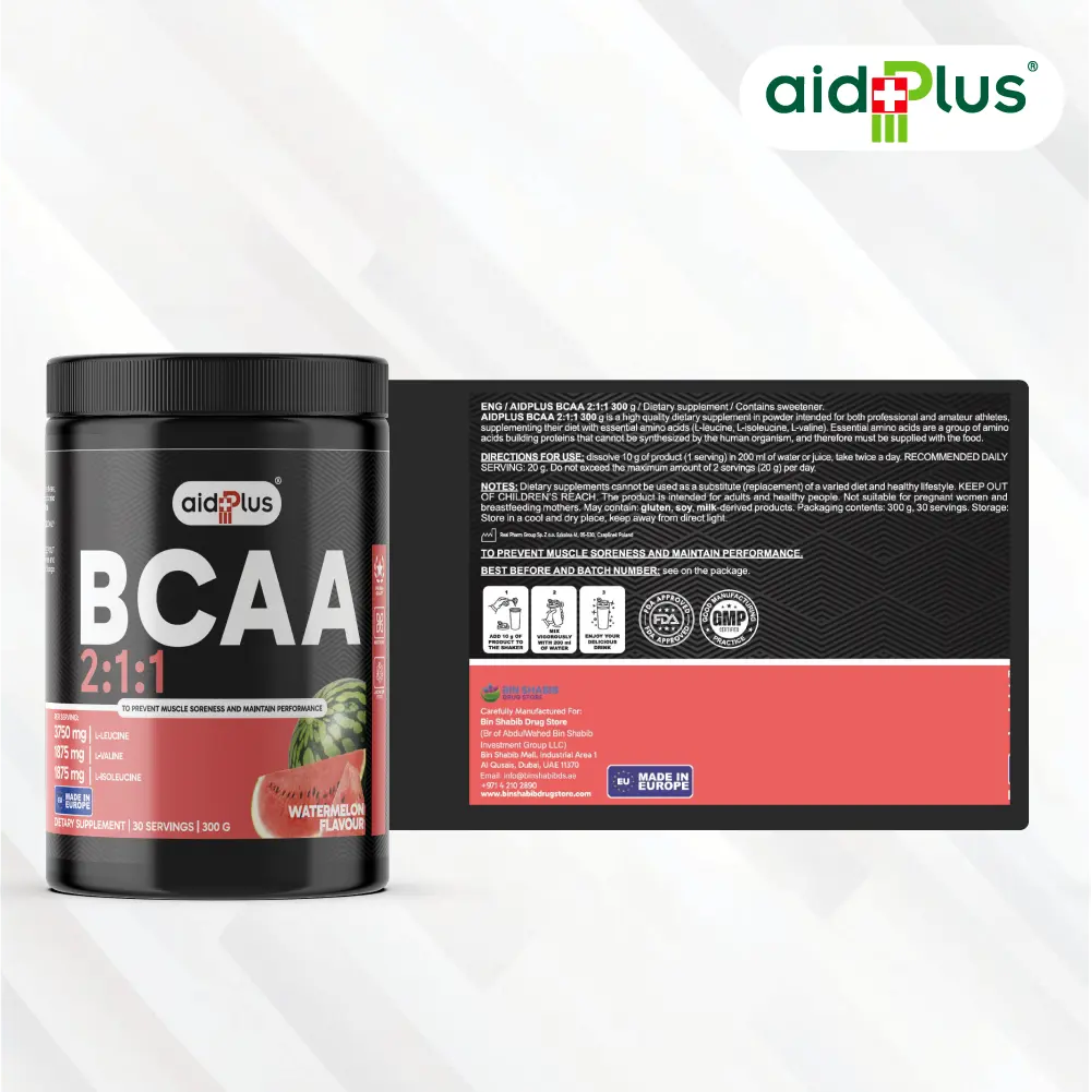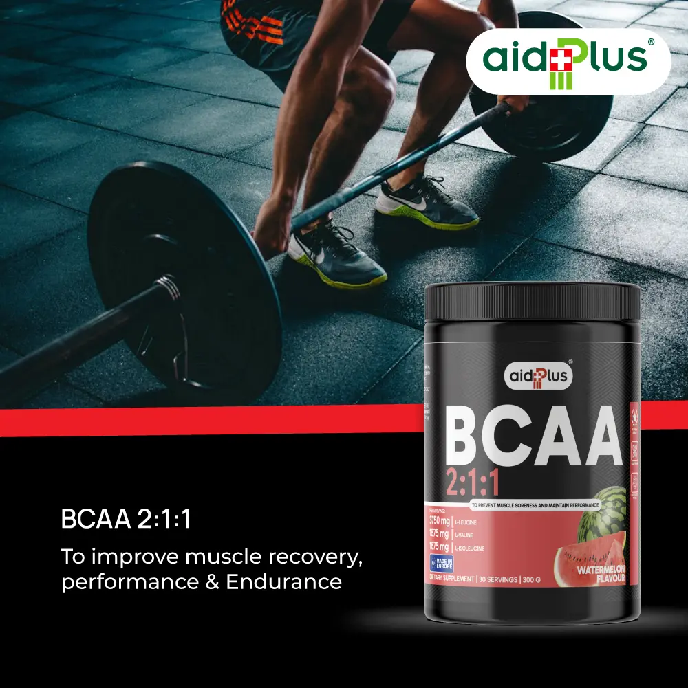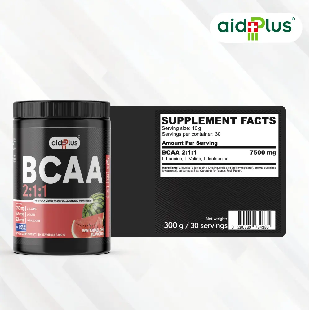 AidPlus BCAA 2:1:1 Watermelon 300g is formulated to support muscle recovery, endurance, and workout performance. Each serving delivers a balanced 2:1:1 ratio of BCAAs (L-Leucine, L-Isoleucine, L-Valine) to help maintain muscle function during training.