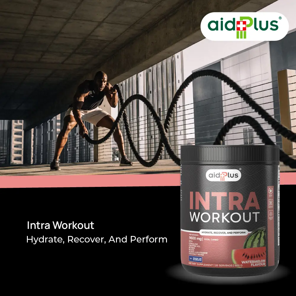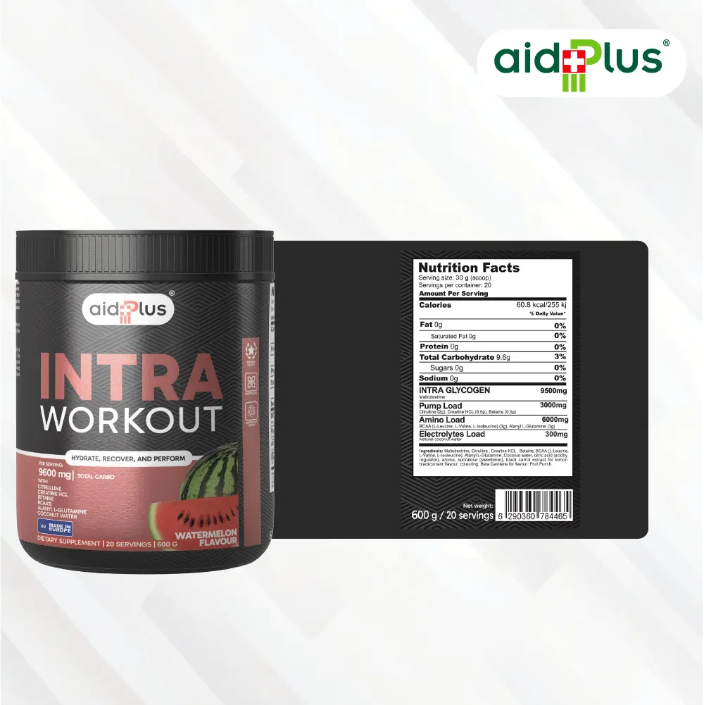 AidPlus Intra Workout Watermelon 600g is designed to support hydration, endurance, and performance during workouts. Each 30g serving provides a blend of carbohydrates, amino acids, and electrolytes to help maintain energy levels and reduce fatigue while training.