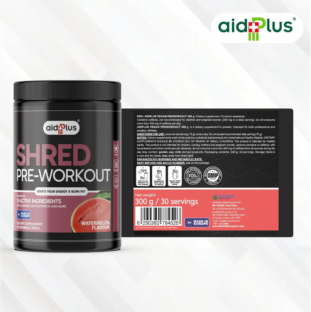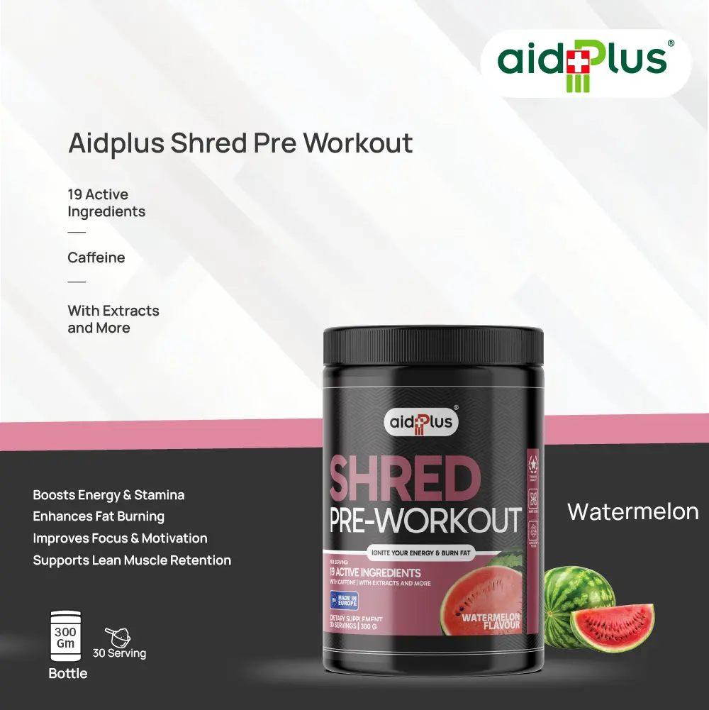 AidPlus Pre-Workout Shred Watermelon 300g is designed to support energy, focus, and workout performance. Each serving includes a blend of ingredients such as caffeine, beta-alanine, and amino acids to help maintain endurance and training intensity.