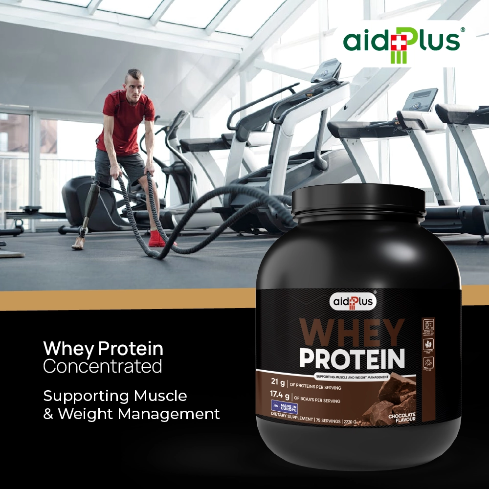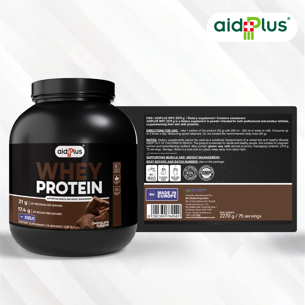 AidPlus WPC Chocolate 2270g Whey Protein Concentrate is designed to support muscle recovery and daily protein intake. Each 30g serving provides 21g of high-quality protein with moderate fat and low sugar, making it suitable for active adults and fitness routines.