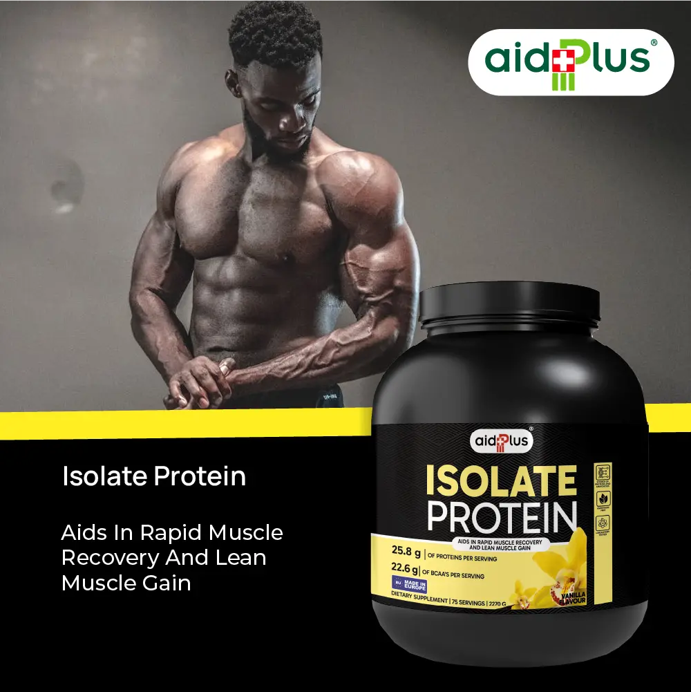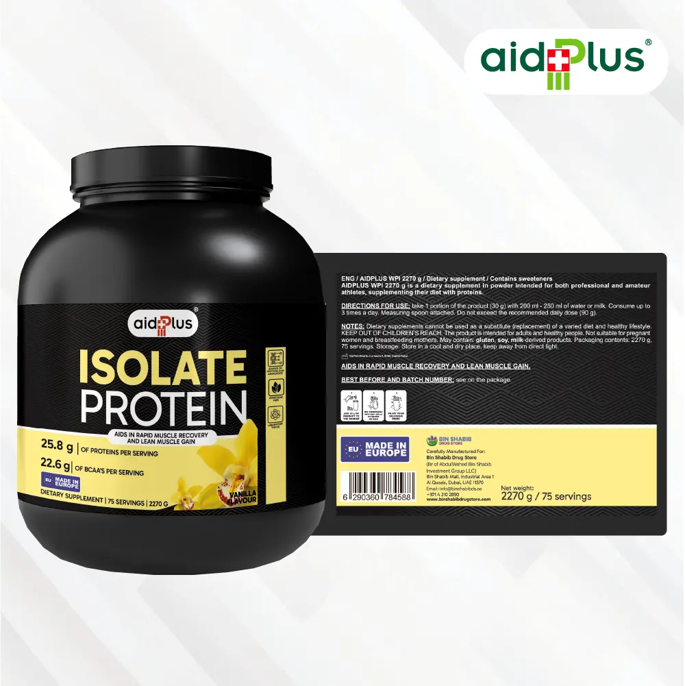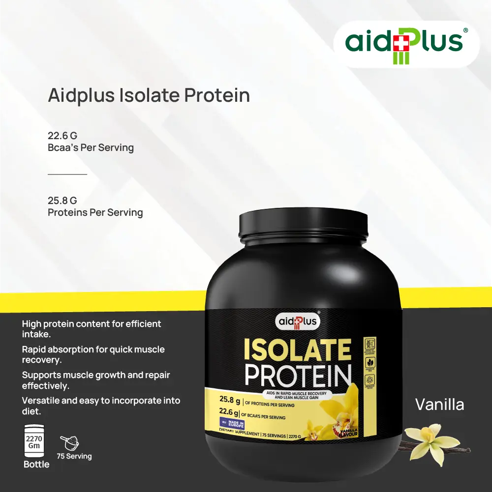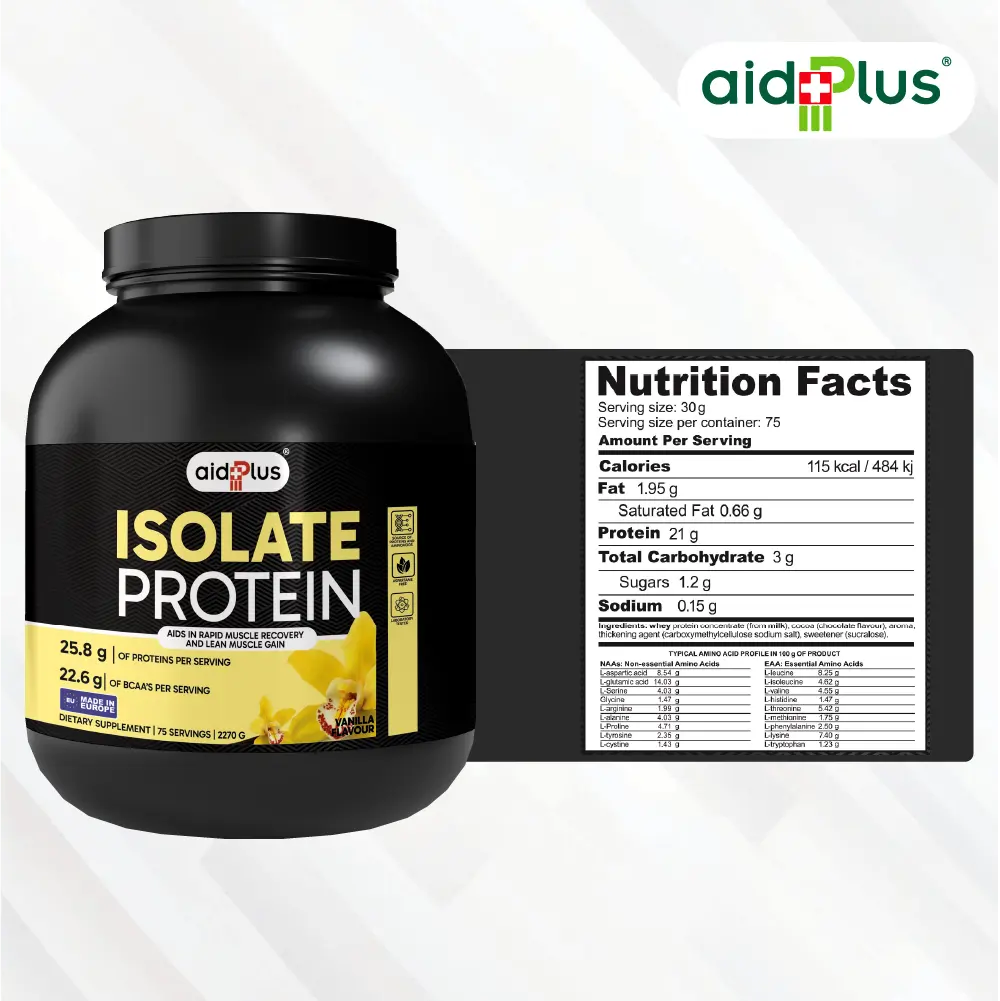 AidPlus WPI Vanilla 2270g Whey Protein Isolate delivers high-quality protein for lean muscle growth and fast recovery. Each 30g serving provides 25.8g protein with low fat and carbs, making it ideal for athletes and fitness-focused adults.